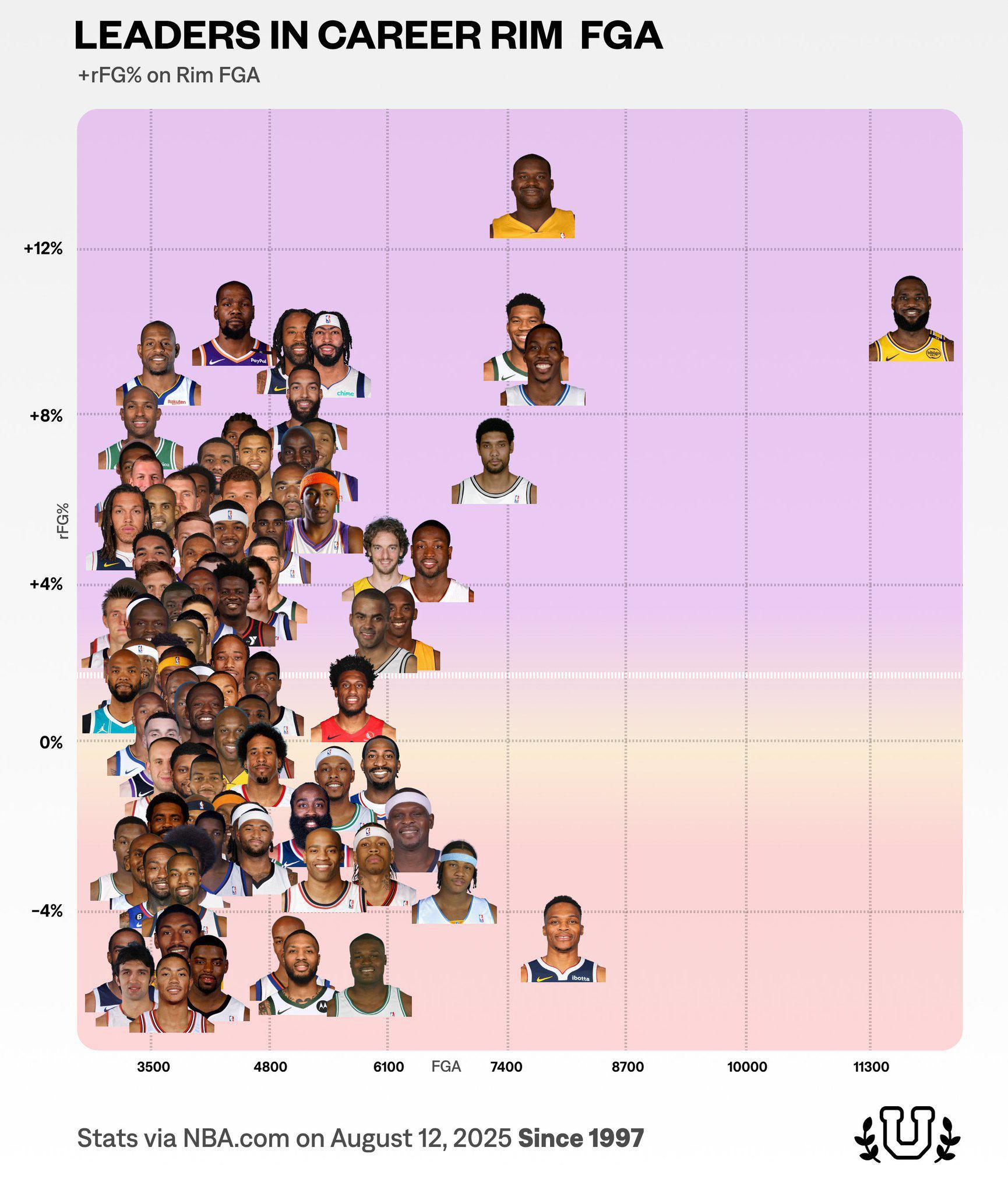 雷速体育8月14日讯 近日美媒NBA University更新了社交媒体,盘点了NBA历史上百大攻筐高手,统计时间是从1997年到现在,坐标图里的横坐标代表篮下出手次数,越往右代表出手数越多;纵坐标代表篮下出手效率和平均水平的差距,越往上代表效率越高。